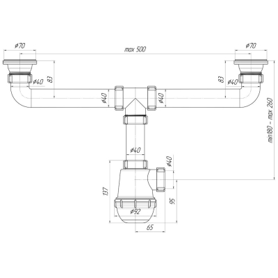 Сифон для кухонной мойки Ани Грот 1 1/2" *40 A3000 двойной для кухонной мойки с двумя чашами и сливными отверстиями диаметром 5 см. Выход для подключения к канализации-4 см. Диаметр резьбы-1 1\2". Величина гидрозатвора-6 см. Максимальное расстояние между горловинами-50 см. Материал горловины-нержавеющая сталь. Изображение и цвет на мониторе могут отличаться от оригинала. |