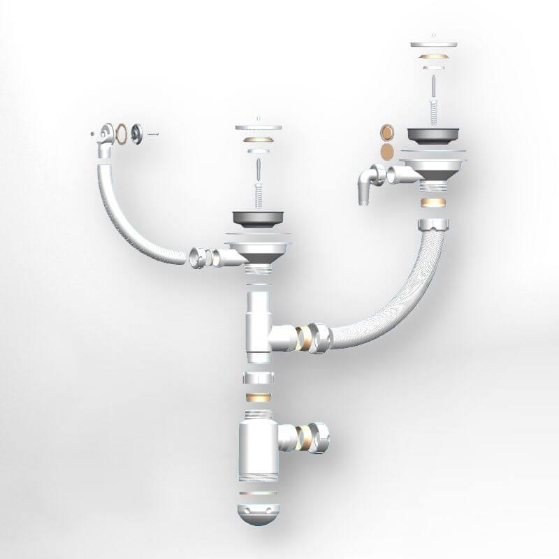 Сифон Marrbaxx Marrbaxx Grand 341-11-24 3 1/2"*40, СН 891-11-22 для мойки из искусственного камня на полторы/две чаши, круглый перелив, с отводом под посудомоечную машину, без гофрированной трубки. Изображение носит ознакомительный характер - сам товар и его комплектация могут отличаться от оригинала. Комплектность: