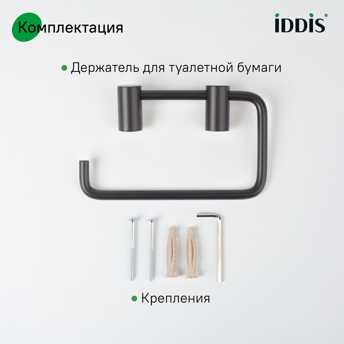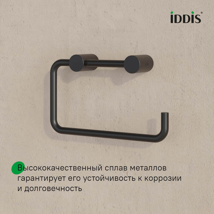Свойства. Держатель для туалетной бумаги из прочного и устойчивого к коррозии сплава металлов с электрофоретическим покрытием. Цвет черный матовый. Производство. Сегодня торговая марка IDDIS занимает на российском рынке прочные позиции и благодаря непревзойденному качеству своей сантехники, ее привлекательной стоимости и современному дизайну. Качество. Собственные стандарты качества SKL Group. Полный контроль от проектирования до выхода на рынок. Изображение и цвет на мониторе могут отличаться от оригинала. Комплектность:
