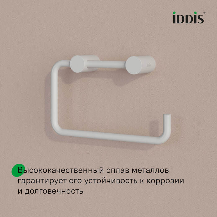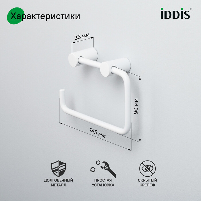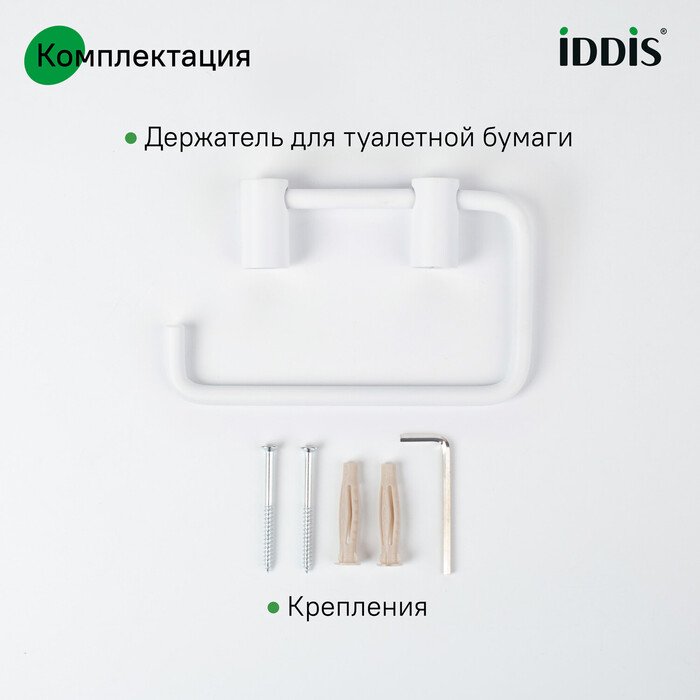 Свойства. Держатель для туалетной бумаги из прочного и устойчивого к коррозии сплава металлов с электрофоретическим покрытием. Цвет белый матовый. Производство. Сегодня торговая марка IDDIS занимает на российском рынке прочные позиции и благодаря непревзойденному качеству своей сантехники, ее привлекательной стоимости и современному дизайну. Качество. Собственные стандарты качества SKL Group. Полный контроль от проектирования до выхода на рынок. Изображение и цвет на мониторе могут отличаться от оригинала. Комплектность:
