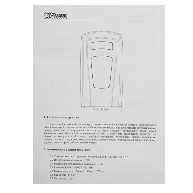 Дозатор для антисептика GFmark 719, сенсорный, 1000 мл. Все характеристики |