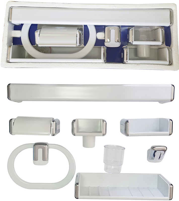 В комплекте: держатель для полотенца, держатель-кольцо, держатель туалетной бумаги, держатель зубных щеток и пасты, стакан, крючок, полка большая, мыльница. |