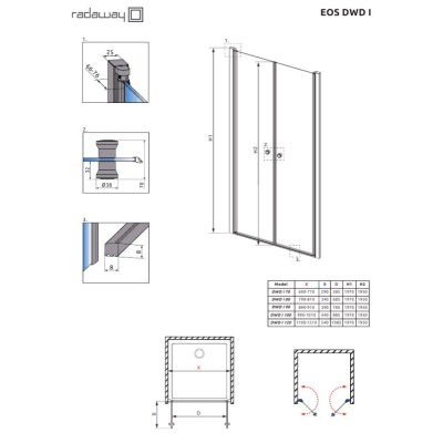 Душевая дверь Radaway Eos DWD 100x197 137723-01-01, с двумя распашными створками из закаленного безопасного стекла.Свойства. Установка в нишу. Дверь открывается наружу и внутрь. Для установки на поддон или непосредственно на пол. Материал-безопасное закаленное стекло толщиной 6 мм. Стекло крепится к стене с помощью пристенных профилей с регулировкой. Цилиндрические петли с подъемно-опускным механизмом, что способствует тихому открыванию двери и долгосрочной службе нижнего уплотнителя. Прочные алюминиевые стабилизаторы гарантируют стабильную конструкцию кабины. Магнитный уплотнитель обеспечивает герметичность кабины. Уплотнители, устойчивые к изменениям температуры и влаги. Форма порога способствует отводу воды внутрь кабины. Антигрязевое покрытие стекла EasyClean. Металлические ручки. Душевая дверь Eos DWD 100x197 см 137723-01-01 для установки на поддон или непосредственно на пол. EasyClean. Антигрязевое покрытие стекла. Капли воды не удерживаются на поверхности стекла и стекают, не оставляя следа. Технология гарантирует эффективную и длительную защиту от коррозии, размножения бактерий и сохранение внешнего вида долгие годы при бережном уходе. Полимерный защитный слой в процессе обработки становится частью самого закаленного стекла, а не отдельно нанесенной пленкой на поверхность. Производство. 100% Польша. Компания Radaway один из ведущих европейских производителей душевых ограждений. Душевые кабины, двери и шторки на ванну завоевали популярность не только на рынках Европы и стран СНГ, но и во всем мире. Завод располагается недалеко от Познани. Качество. Продукция отвечает всем европейским и всемирным стандартам. Каждое изделие проходит многоэтапный контроль качества и разные испытания. Дизайн. Собственная команда инженеров-конструкторов и дизайнеров. Душевые ограждения Radaway позволяют оформить уникальный интерьер для ванной комнаты и предлагают нестандартные варианты. Множество размеров, цветов стекол и профилей, любые формы и самые смелые решения. Изображение и цвет на мониторе могут отличаться от оригинала. Комплектность: