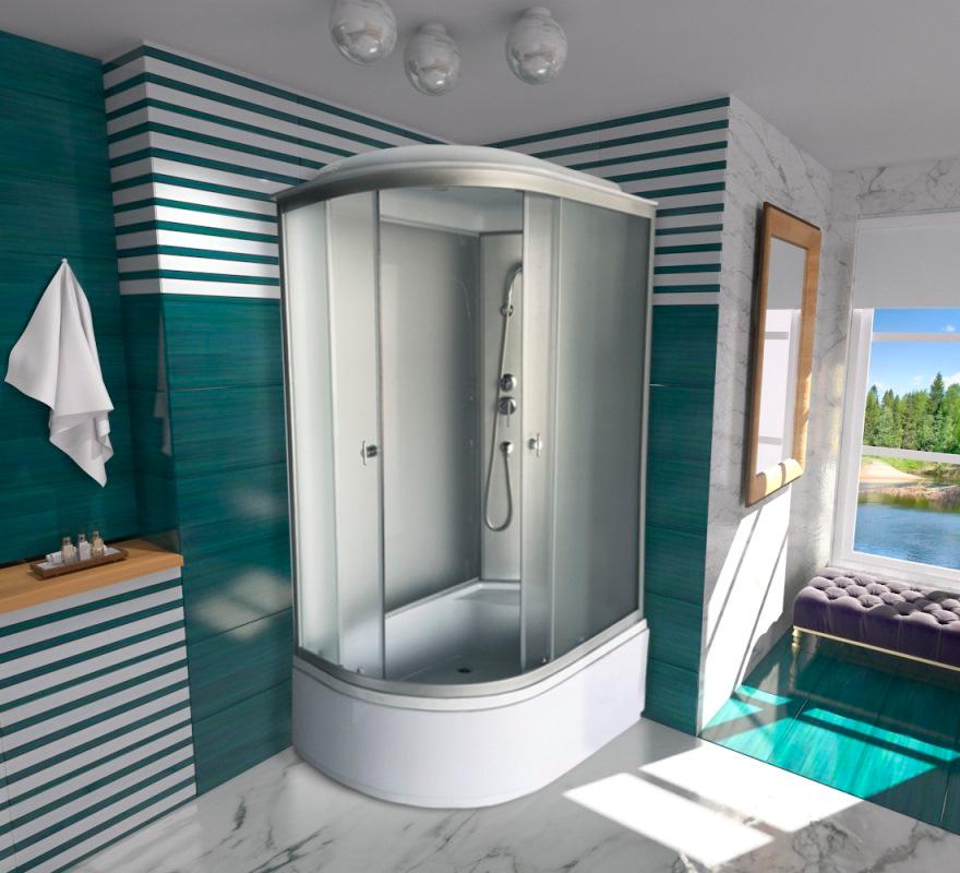 В комплекте: поддон, трехрежимный ручной душ с держателем, двухрежимный смеситель, верхний душ, сифон с гофрой и гидрозатвором. |
