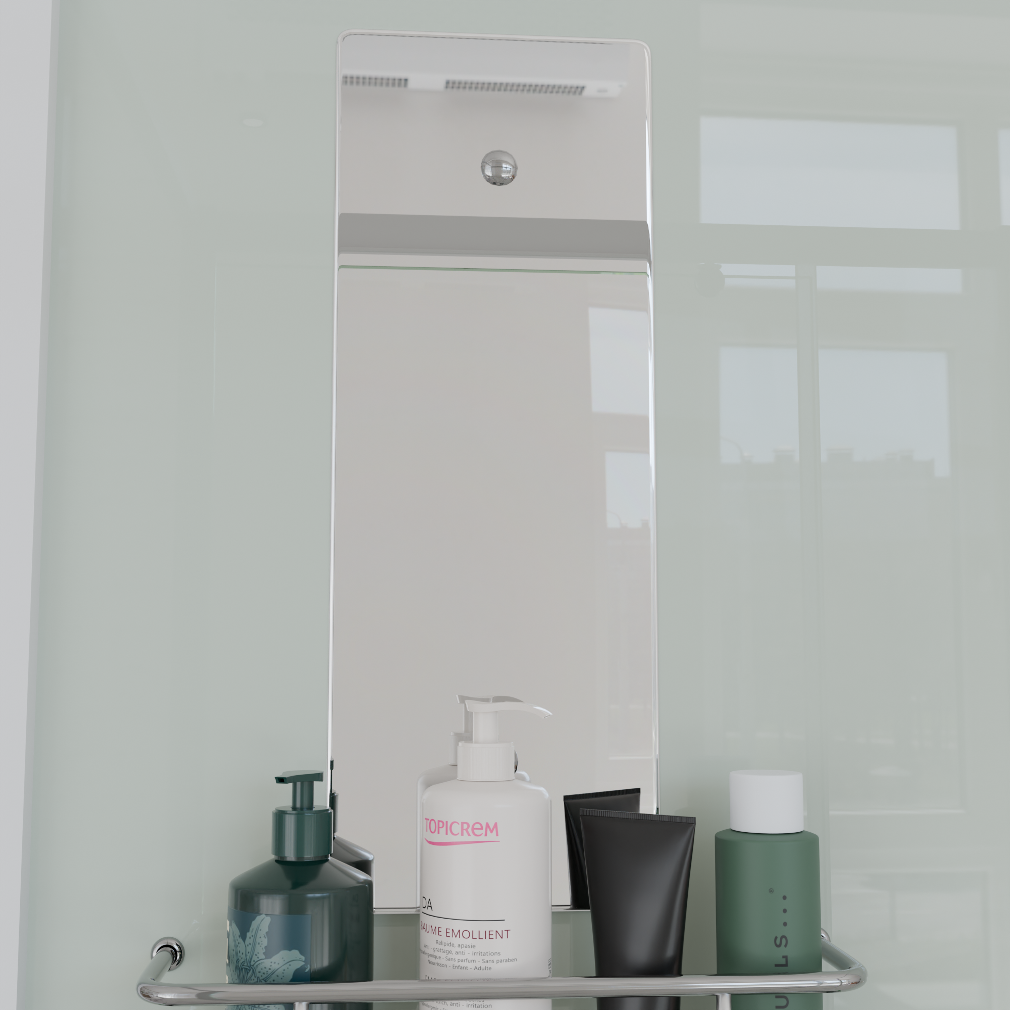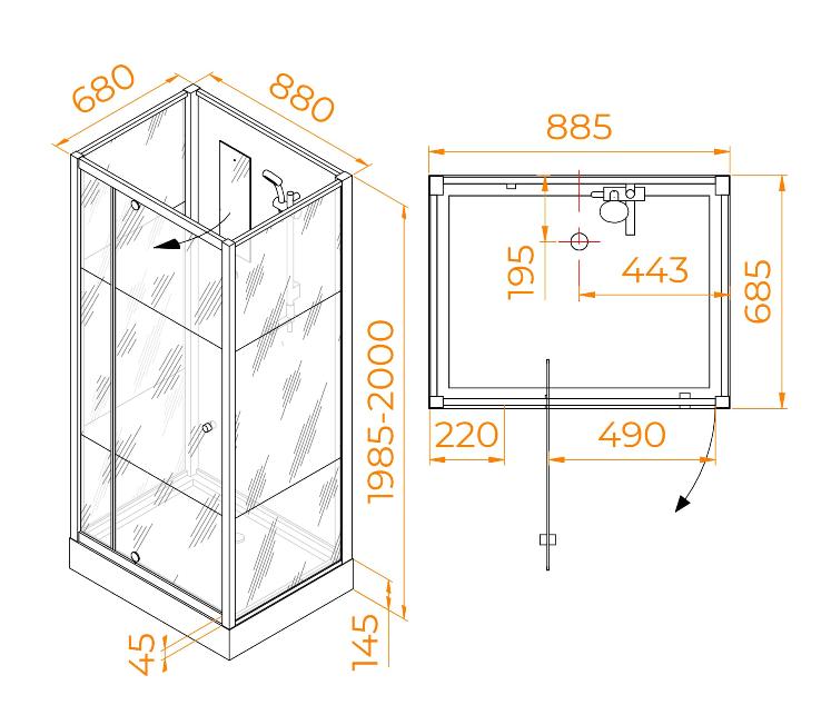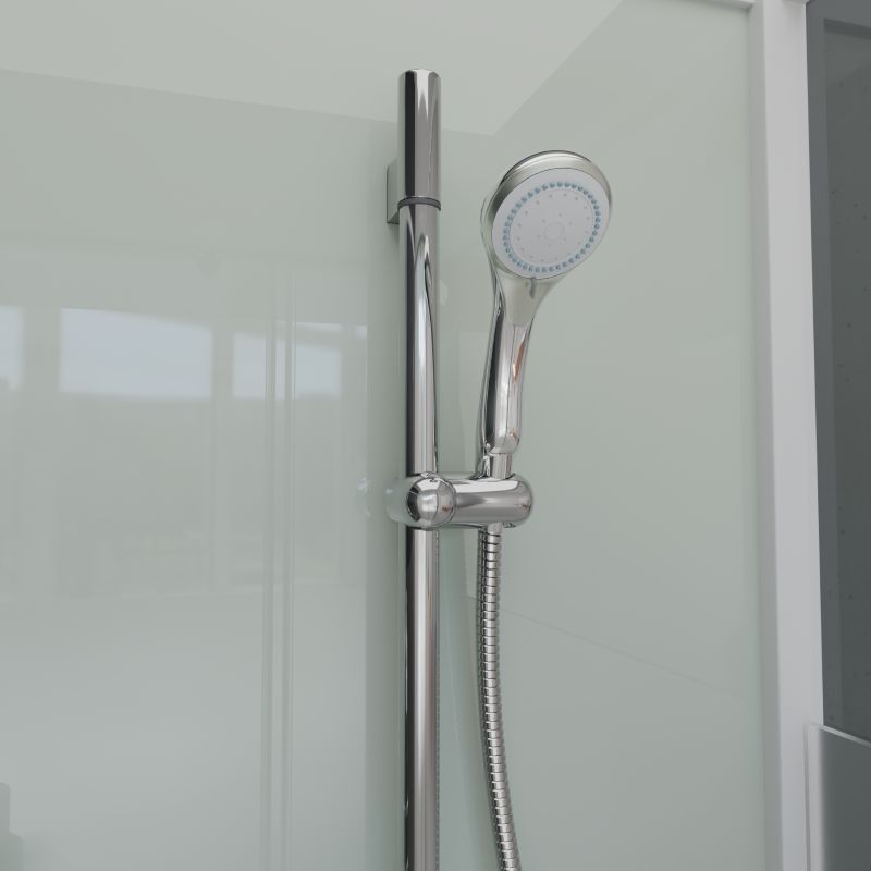 В комплекте: полочка, зеркало, смеситель, ручной душ на регулируемой штанге. |