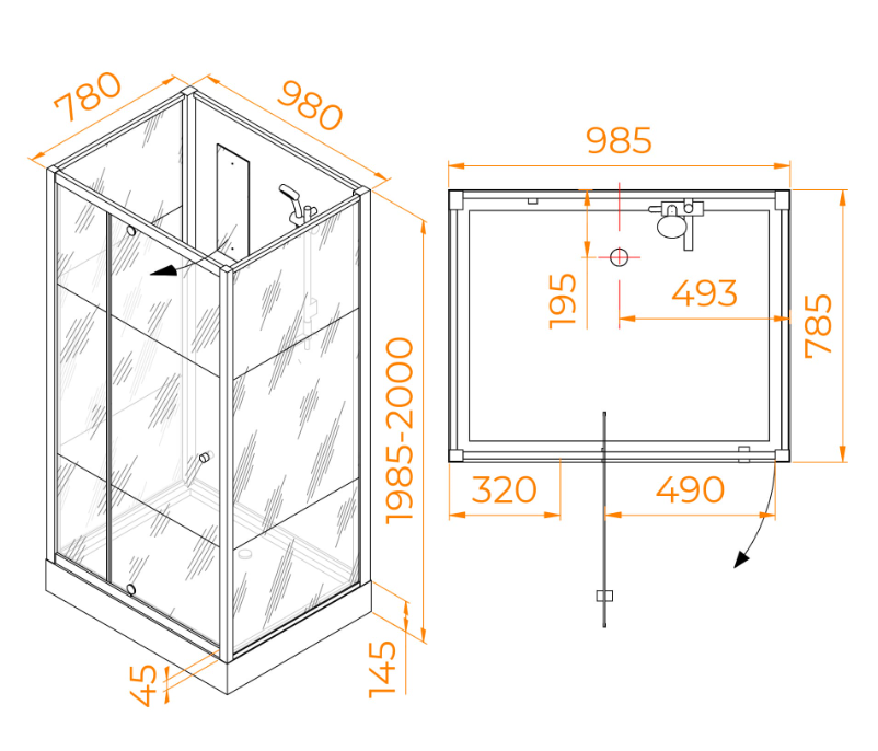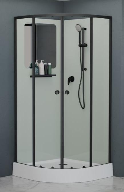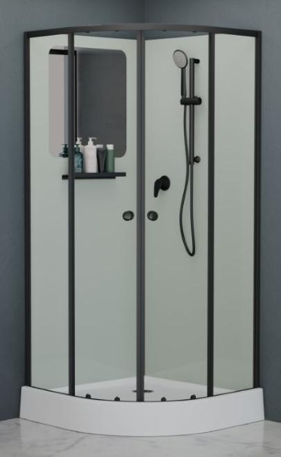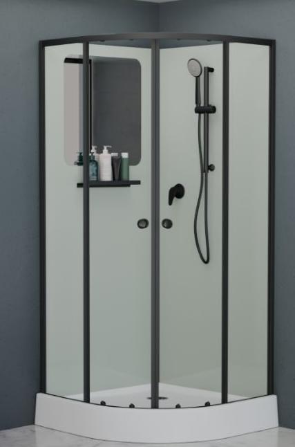 В комплекте: полочка, зеркало, смеситель, ручной душ на регулируемой штанге. |