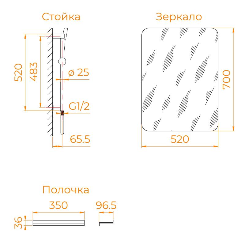 В комплекте: полочка, зеркало, смеситель, ручной душ на регулируемой штанге. |