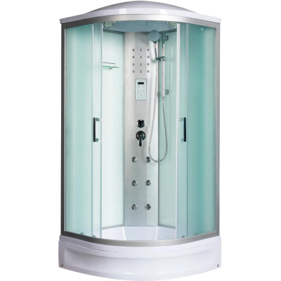 В комплекте: гидромассаж 6 форсунок, верхний свет, подсветка “лунный свет”, радио, сенсорный дисплей, полочки, зеркало, смеситель без излива, ручной душ, тропический душ, вентиляция, электропитание 12V, душевой поддон акрил с антискольжением, экран съемный, сифон с гидрозатвором. |