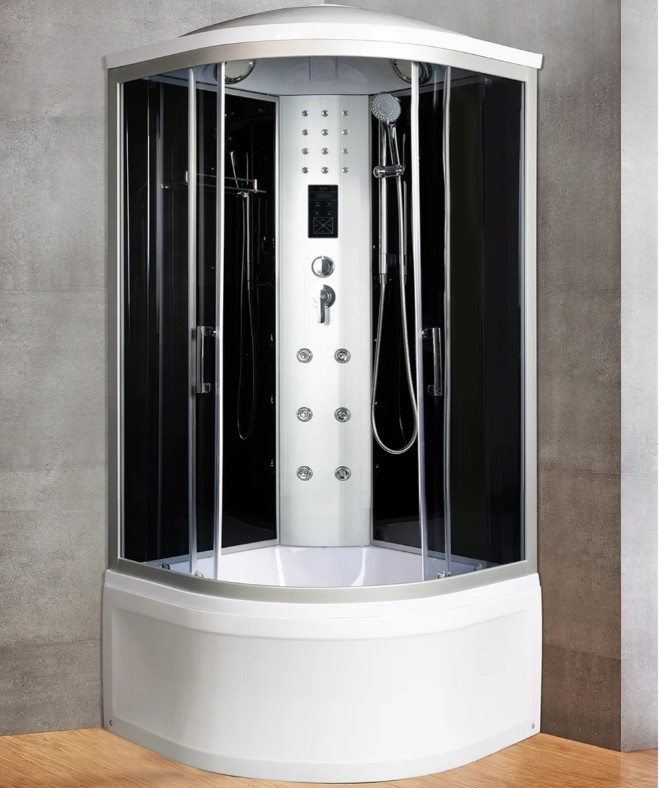 В комплекте: гидромассаж 6 форсунок, верхний свет, подсветка “лунный свет”, радио, сенсорный дисплей, полочки, зеркало, смеситель без излива, ручной душ, тропический душ, вентиляция, электропитание 12V, душевой поддон акрил с антискольжением и сиденьем, экран съемный, сифон с гидрозатвором. |