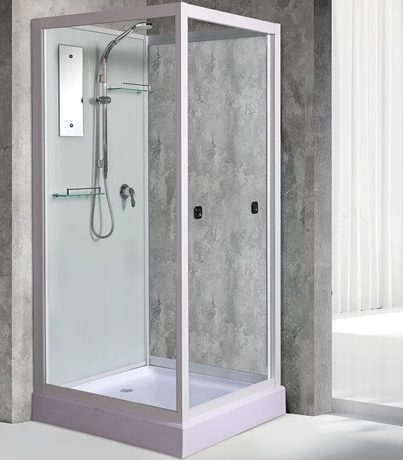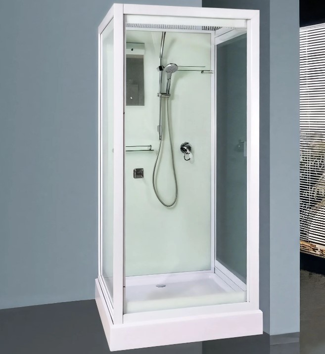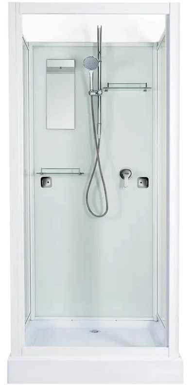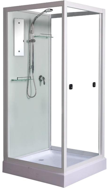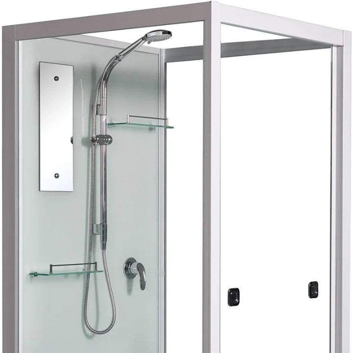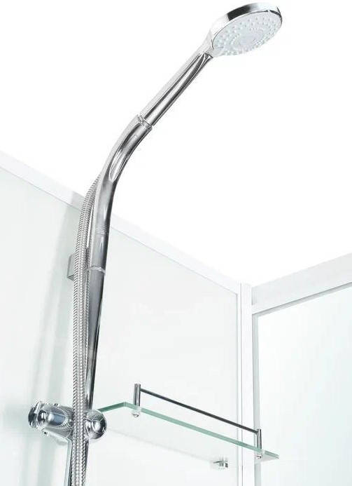В комплекте: верхний свет, полочки, зеркало, смеситель без излива, ручной душ, душевой поддон акрил с антискольжением, экран несъемный, сифон с гидрозатвором. |