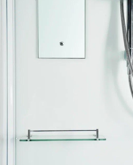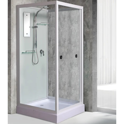 В комплекте: верхний свет, полочки, зеркало, смеситель без излива, ручной душ, душевой поддон акрил с антискольжением, экран несъемный, сифон с гидрозатвором. |