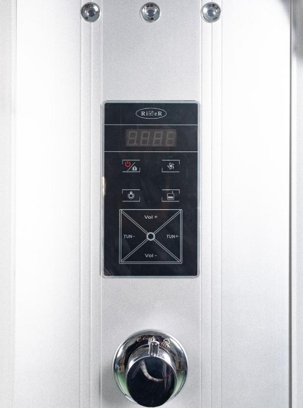 В комплекте: гидромассаж 6 форсунок, верхний свет, подсветка “лунный свет”, радио, сенсорный дисплей, полочки, зеркало, смеситель с изливом, ручной душ, тропический душ, вентиляция, электропитание 12V, душевой поддон акрил с антискольжением и сиденьем, экран съемный, сифон с гидрозатвором. |