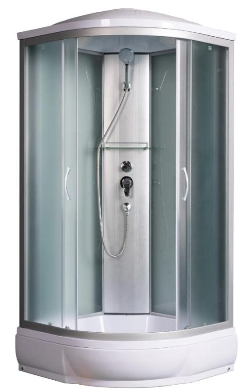 В комплекте: полочки, смеситель без излива, ручной душ, тропический душ, душевой поддон акрил с антискольжением и сиденьем, экран съемный, сифон с гидрозатвором. |