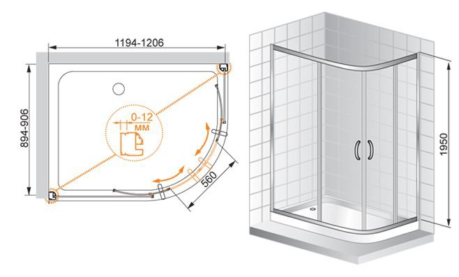 Дополнительно комплектуется: смеситель, поддон типа RH (радиус 550). |