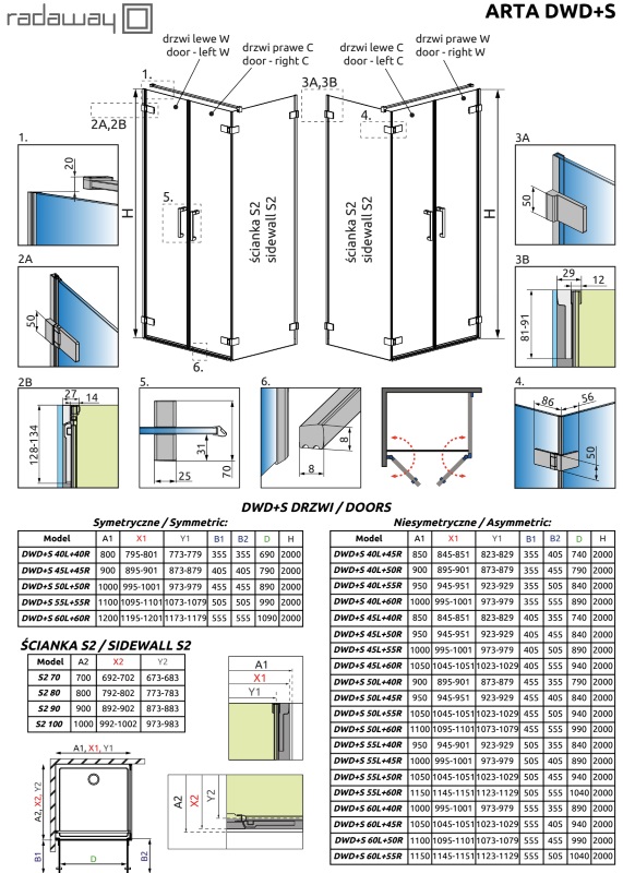 Душевой уголок Radaway Arta DWD+S 110x100, правый, прямоугольный, с распашными дверями 386182-03-01R+386059-03-01L+386112-03-01.Свойства. Ширина входа-99 см. Двери открываются внутрь и наружу. Ширина створок двери-50(R)+60(L) см. Материал-безопасное закаленное стекло толщиной 8 мм. Латунные, хромированные петли с подъемно-опускным механизмом, что гарантирует тихое открывание двери и долгосрочную службу нижнего уплотнителя. Изнутри петля заподлицо со стеклом, что облегчает уход за кабиной. Регулировка пристенной петли до 6 мм. Для регулировки зазоров до 10 мм стекла при стене используется уплотнительный профиль. Угловая петля со скрытым монтажом–изнутри плоская поверхность. Прочные алюминиевые стабилизаторы гарантируют стабильную конструкцию кабины. Магнитный уплотнитель обеспечивает герметичность кабины. Уплотнители, устойчивые к изменениям температуры и влаги. Душевой уголок Radaway Arta DWD+S 110x100 см 386182-03-01R+386059-03-01L+386112-03-01, правый, прямоугольный, с распашными дверями для установки на поддон или непосредственно на пол. EasyClean. Антигрязевое покрытие стекла. Капли воды не удерживаются на поверхности стекла и стекают, не оставляя следа. Технология гарантирует эффективную и длительную защиту от коррозии, размножения бактерий и сохранение внешнего вида долгие годы при бережном уходе. Полимерный защитный слой в процессе обработки становится частью самого закаленного стекла, а не отдельно нанесенной пленкой на поверхность. Производство. 100% Польша. Компания Radaway один из ведущих европейских производителей душевых ограждений. Душевые кабины, двери и шторки на ванну завоевали популярность не только на рынках Европы и стран СНГ, но и во всем мире. Завод располагается недалеко от Познани. Качество. Продукция отвечает всем европейским и всемирным стандартам. Каждое изделие проходит многоэтапный контроль качества и разные испытания. Дизайн. Собственная команда инженеров-конструкторов и дизайнеров. Душевые ограждения Radaway позволяют оформить уникальный интерьер для ванной комнаты и предлагают нестандартные варианты. Множество размеров, цветов стекол и профилей, любые формы и самые смелые решения. Изображение и цвет на мониторе могут отличаться от оригинала. Комплектность: