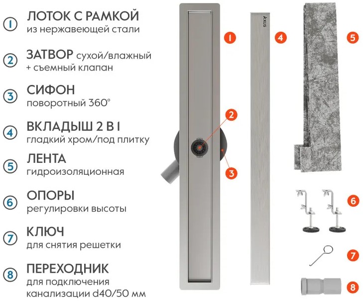 Душевой трап Axus Universal 1000 с решеткой, хром, tdu1000. Все характеристики |