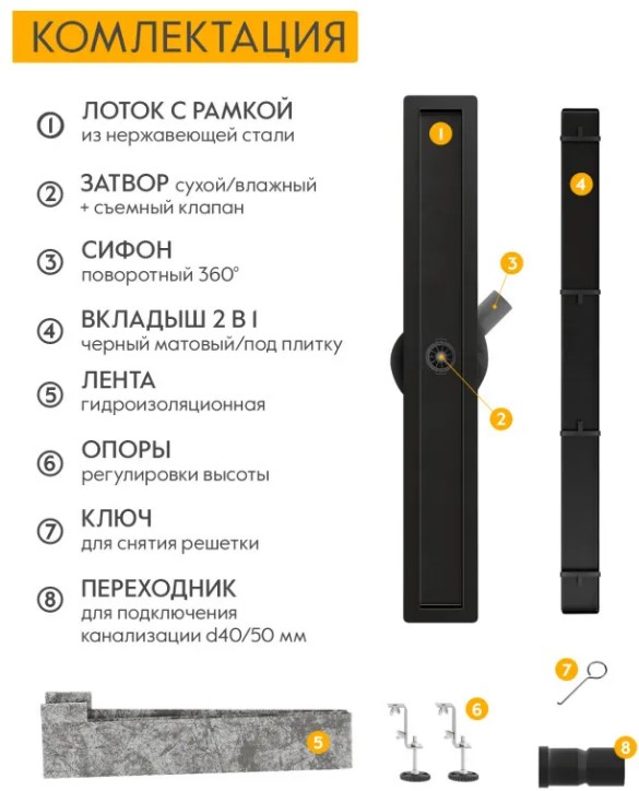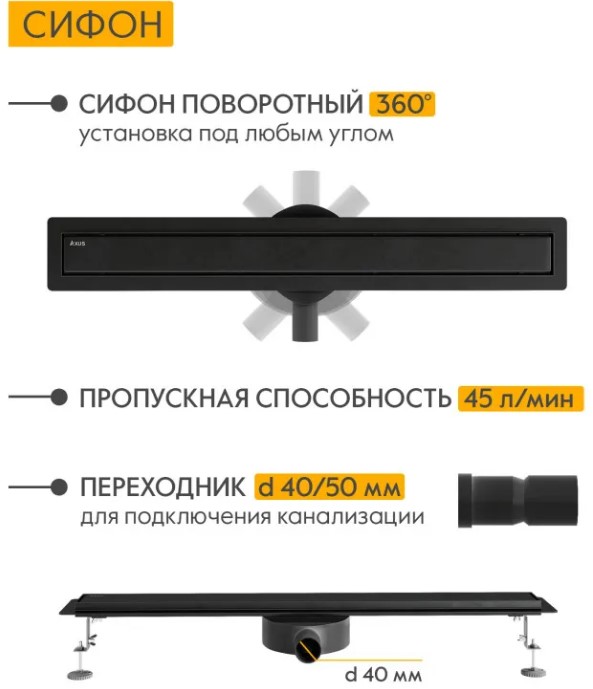 Душевой трап Axus Universal 600 Black с решеткой, черный, tdu600b. Все характеристики |