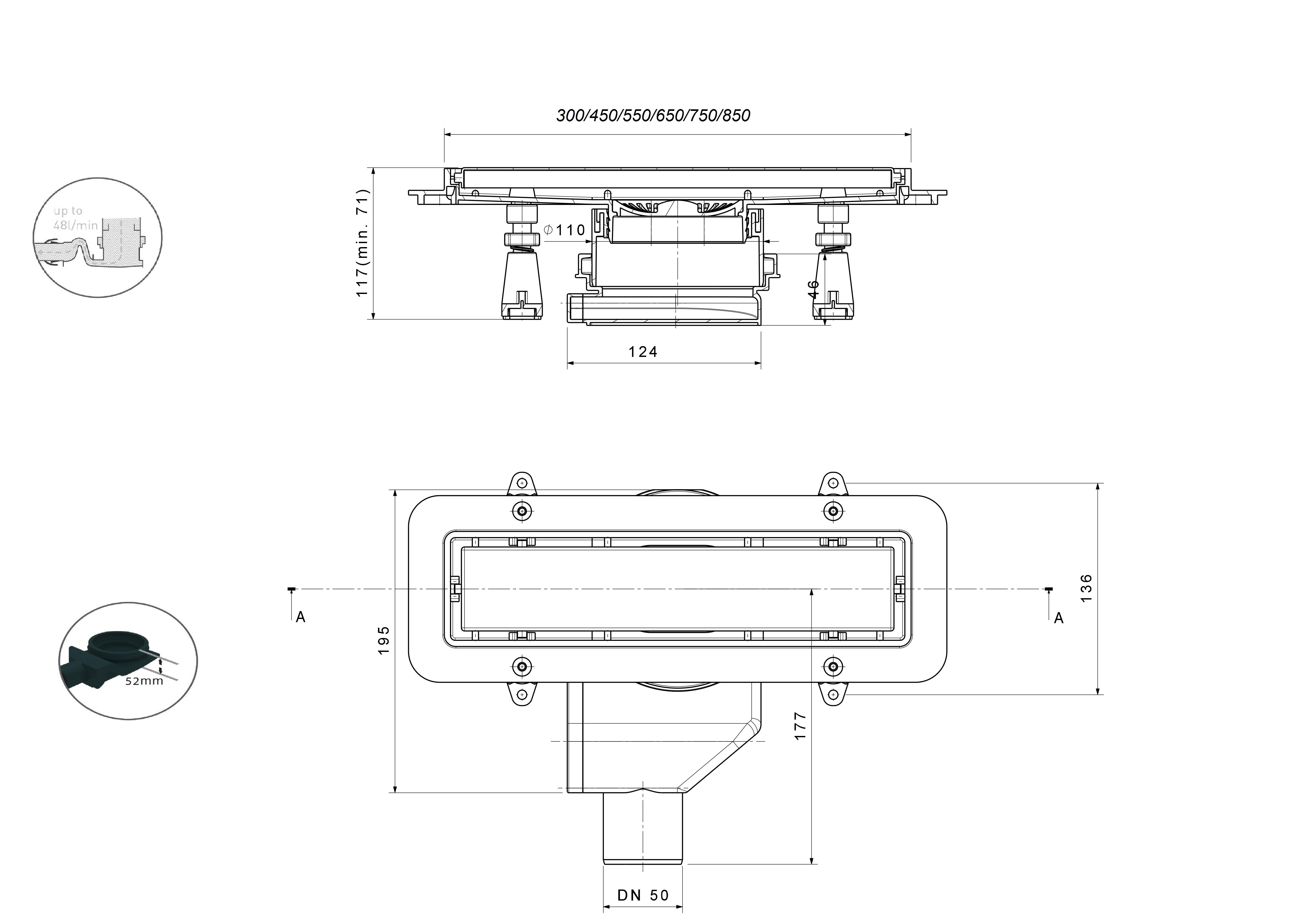Душевой лоток Pestan Line 550 13100003 с деталями из полипропилена, который устойчив к механическим, химическим и термическим повреждениям. Благодаря S-форме сифона, мокрый гидрозатвор надежно защищает от проникновения запаха из канализации. Ультранизкая высота сифона 52 мм. Высота водяного столба 30 мм. (в соответствии с EN 1253). Возможность регулирования высоты монтажа за счет ножек, входящих в комплект, что позволяют быстро и удобно установить желоб и выровнять его в горизонтальной плоскости. Рамка и решеткой из нержавеющей стали (AISI 304 SS), класс К3 (до 300 кг нагрузки, в соответствии с EN 1253). Конструктивно возможна вкладка в рамку керамическую плитку, мрамор, закаленное стекло. Решетка является частью комплекта. Изображение и цвет на мониторе могут отличаться от оригинала. |