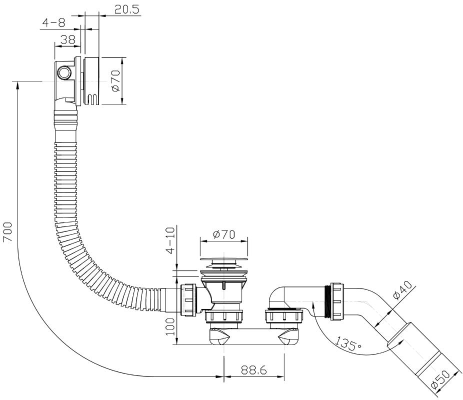 Сифон для ванны Roxen R70S-CH клик-клак, с наполнением, хром. Все характеристики |