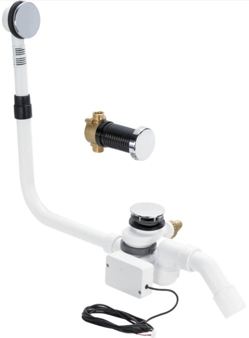 В комплекте: хромированная накладка переливного отверстия, хромированная накладка сливного отверстия, узел подачи воды, гидрозатвор, отводящее колено 45°, обратный клапан скрытого монтажа DN 20, EN 1717 защитное устройство DB (обратный клапан), с декоративной розеткой RU2, донный клапан с электрическим подъемным механизмом, электродвигатель постоянного тока 12 В/0,5 A, импульсное управление, длительность импульса макс. 3 сек., соединительный кабель JST/XHP 5, длина 3 м. |