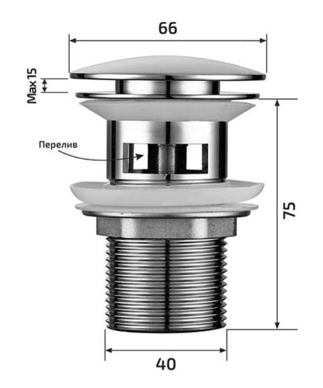 В комплекте: корпус донного клапана, хромированная стальная заглушка, силиконовая прокладка (2 шт.), гайка. |