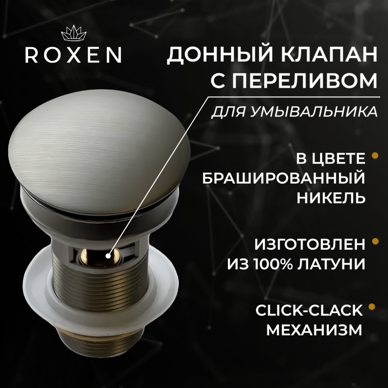 Донный клапан Roxen P02BN с переливом, браш. никель. Все характеристики |