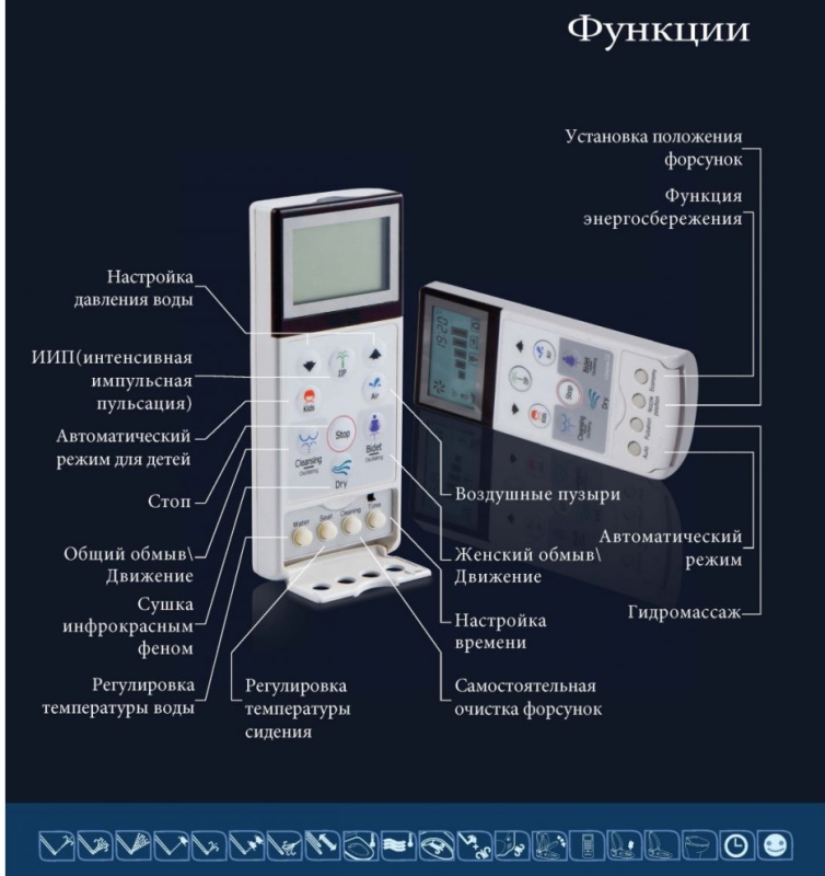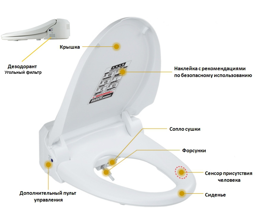 Крышка-биде SansPa JK-1000RU для унитаза, с сиденьем, электронная умная крышка с пультом ДУ.Класс Премиум - 45 разнообразных функций. Полный набор для гигиены и комфорта. Быстросъемные форсунки 2 в 1 с использованием серебряной нанотехнологии и антибактериальным покрытием. Подходит для семей c маленькими детьми и людьми преклонного возраста, т.к. присутствуют режимы «Дети» и «Авто», офиса, гостиничного номера или медицинского учреждения. Крышка-биде JK-1000RU лидер продаж среди моделей с дистанционным пультом. Базовые функции. Общий обмыв - удобная и простая личная гигиена для всех. Замена туалетной бумаги. Женское биде - ежедневная забота об интимной гигиене и личном комфорте для женщин. Сушка теплым воздухом - приятный теплый поток воздуха для сушки. Регулировка температуры воды - выбор комфортной температуры воды. Регулировка давления воды - выбор комфортного напора воды. Регулировка температуры сушки - выбор комфортной температуры воздуха. Подогрев сиденья - выбор комфортной температуры сиденья. Регулировка положения форсунок - выбор положения форсунок под индивидуальные особенности. Режим Эко - снижает расход энергии. Фильтрация - вода проходит через ионный фильтр, очищаясь от мелкий частиц. Датчик присутствия - включение умной крышки только когда присядет человек. Автоматическая очистка - форсунки очищаются до и после каждого использования. Air-bubbles - пузырьки воздуха в струе воды для более мягкого и освежающего омовения. Система электробезопасности - предохранители предотвращают электрозамыкание и гарантируют безопасность изделия. Ультразвуковая спайка - защищает электронные компоненты от попадания влаги. Система самодиагностики - информирование при выявлении неисправности. Кнопка ВЛК\ВЫКЛ - кнопка включения и выключения без необходимости подключения к сети или отключения при каждом использовании. Русификация - управление и инструкция на русском языке. Микролифт крышки и сиденья - плавное и беззвучное медленное опускание. Уникальные функции. Дезодорация - удаление бактерий и неприятных запахов из чаши унитаза при помощи несменного угольного фильтра. Сушка инфракрасным феном - инфракрасный фен очищает воздух во время сушки, что делает процедуру ещё более гигиеничной. Режим Дети - режим удобный для детской гигиены со специальными настройками по температуре, напору воды и времени. Режим Авто - осуществление всей последовательности действий самостоятельно (общее биде, сушка, деодорация). Пульт Д/У - всеми функциями можно управлять дистанционно при помощи пульта с LCD дисплеем, на котором отображаются: время, температура, режим подогрева и какая функция работает в данный момент. Сенсорные кнопки. Функция Массаж - движение форсунок вперед-назад для увеличения области обмыва и обладает эффектом массажа. Функция Воздух - более сильная, но в то же время более нежная струя аэрированной воды способствует эффективному обмыву. Интенсивная импульсная пульсация - способствует облегчению акта дефекации. Антибактериальное покрытие сиденья - запатентованное нано-серебряное покрытие убивает до 99% известных бактерий. Ночная подсветка - низковольтный светодиод мягко подсвечивает чашу унитаза. Часы - настройка времени на пульте. Модель JK-1000R* имеет 3 размера сочетаемости: крышка S-короткая, L-удлиненная, U-округлая. Расстояния для монтажа U: от б