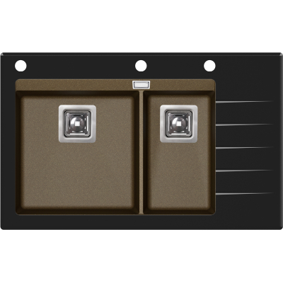 Кухонная мойка Aquasanita Delicia Plus SQD150AW/301B 86x54, врезная, брасс, с чашами из искусственного камня Silicsana (80% кварцевого песка, 20% смесь смолы и наполнителя) и стеклянной полкой. Цвет: 301B-чаша: брасс brass, стекло-черный black. Поверхность чаш-гладкая, непористая, антибактериальная с ионами серебра Ionpure Ag (+). Материал Silicsana устойчив к появлению пятен и воздействию моющих средств, высоким температурам и резкому перепаду температур, механическим и световым воздействиям. Стекло-закаленное, толщина-1 см. Глубина меньшей чаши-18 см. Минимальная ширина шкафа для установки-80 см. Изображение на мониторе может отличаться от оригинала. Комплектность:
