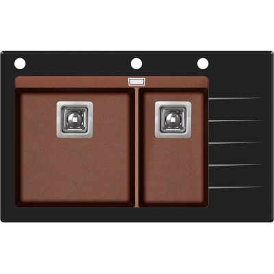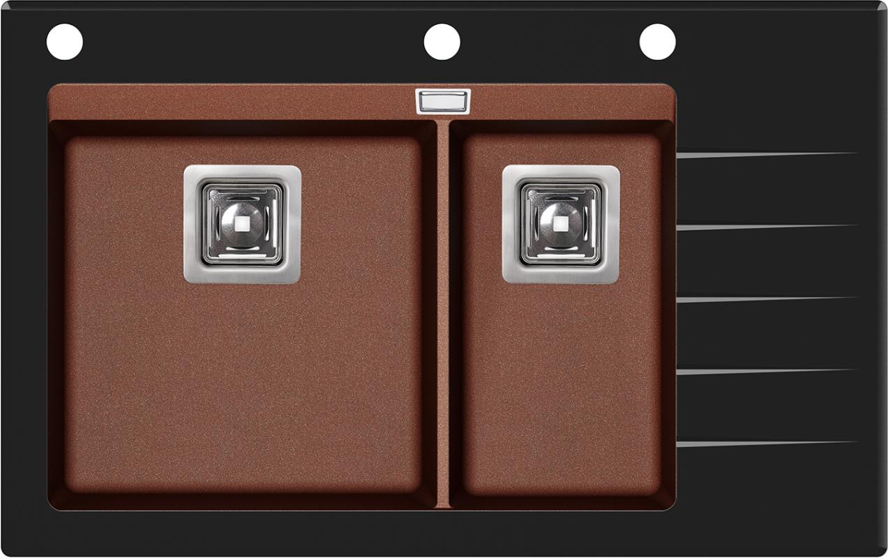 Кухонная мойка Aquasanita Delicia Plus SQD150AW/501B 86x54, врезная, купер, с чашами из искусственного камня Silicsana (80% кварцевого песка, 20% смесь смолы и наполнителя) и стеклянной полкой. Цвет: 501B-чаша: купер copper, стекло-черный black. Поверхность чаш-гладкая, непористая, антибактериальная с ионами серебра Ionpure Ag (+). Материал Silicsana устойчив к появлению пятен и воздействию моющих средств, высоким температурам и резкому перепаду температур, механическим и световым воздействиям. Стекло-закаленное, толщина-1 см. Глубина меньшей чаши-18 см. Минимальная ширина шкафа для установки-80 см. Изображение на мониторе может отличаться от оригинала. Комплектность: