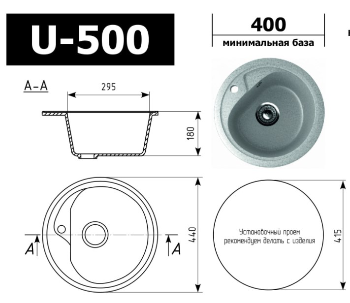 Мойка для кухни Ulgran U-500 44x44, врезная, салатовый 303. Все характеристики |