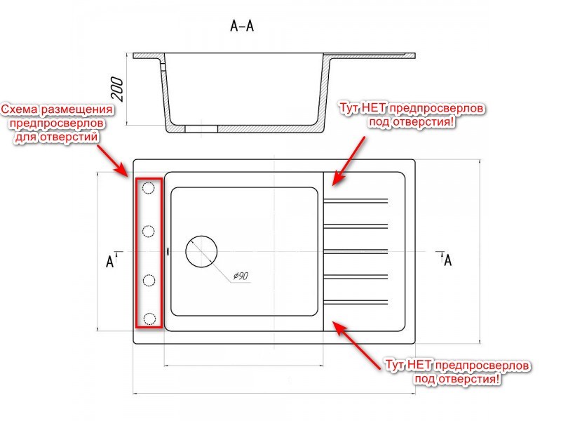 Внимание! Нестандартное размещение предпросверлов под отверстия для смесителя - не в центре мойки, а с краю.В комплекте: сифон GER013. Дополнительно комплектуется: смеситель. |