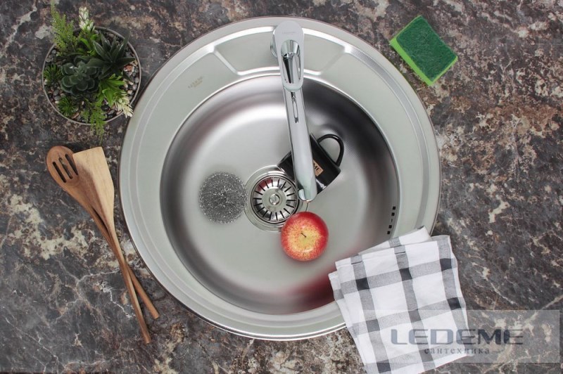 Мойка для кухни Ledeme L64949 49x49, 64949, врезная, декор из нержавеющей стали.Свойства. Нержавеющая сталь толщиной 0.8 мм. Поверхность декорированная (микротекстура), цвет-сатин. Отверстие под смеситель. Антишумовая резиновая подушка снаружи на дне мойки, уменьшает вибрацию. Мойка легка в уходе и чистке. Врезная раковина L64949 49x49 см 64949 с переливом для кухни. Производство. Компания Ledeme представлена на рынке сантехники для ванных комнат и кухонь более 25 лет. Занимая лидирующие позиции на рынке, постоянно совершенствуется и идет в ногу со временем. Фабрика использует современные программные комплексы для проектирования и автоматизированное оборудование для производства изделий. Качество. Для сплавов используются только металлы высшего класса А, что делает продукцию надежной и безопасной для здоровья. Каждая единица проходит все этапы проверки, включая тестирование высоким давлением на выходе. Изделия Ледеме соответствуют европейским стандартам качества CE, американским UL и международным ISO. Оптимальное соотношение цены и качества под разные предпочтения. Изображение и цвет на мониторе могут отличаться от оригинала. Комплектность: