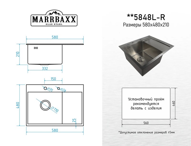 Мойка для кухни Marrbaxx C5848L-MR 58x48, врезная, левая, сатин. Все характеристики |