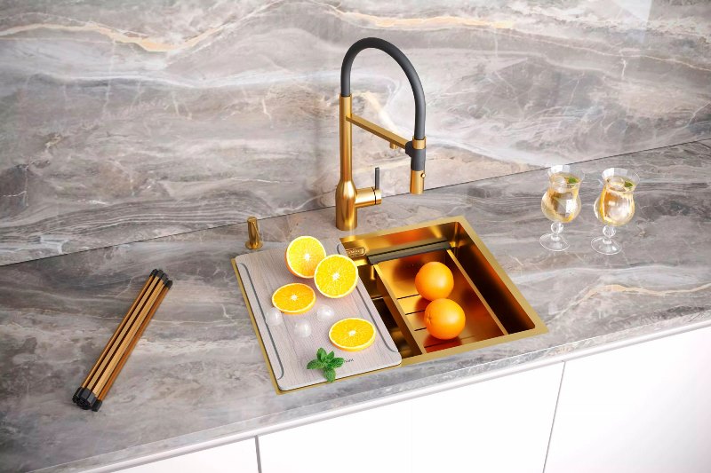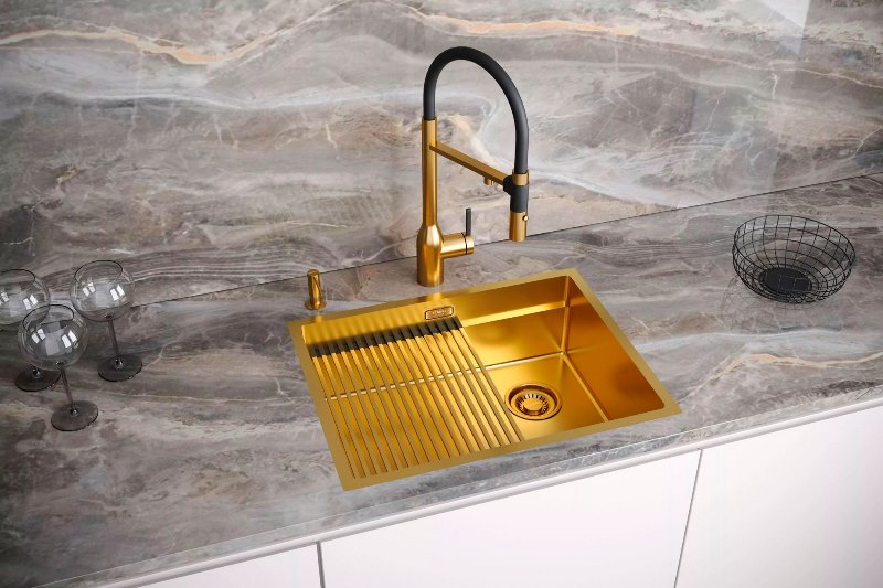 Раковина для кухни Paulmark Next-Pro 58 Uni 58x45 PM705845-BG, под столешницу из нержавеющей стали.Свойства. PVD покрытие. Нержавеющая сталь AISI 304 легирована 18% хрома и 8% никеля. Мойка имеет шумопоглощающее покрытие Stille® на внешней стороне чаши, устойчива к воздействию высоких температур, к образованию ржавчины, деформации, не задерживает загрязнения на поверхности, легка в уходе и чистке. Монтаж на столешницу, вровень со столешницей, под столешницу. Изображение и цвет на мониторе могут отличаться от оригинала. Комплектность: