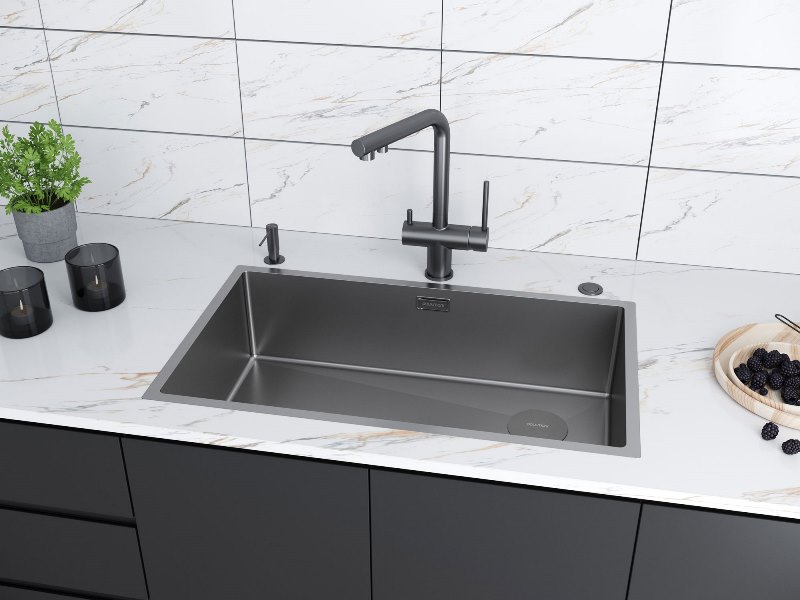 Раковина для кухни Paulmark Next-Skew 74 74x44 PM887444-MG из нержавеющей стали.Свойства. Нержавеющая сталь обладает высокой коррозионной стойкостью, большим запасом механической прочности, а также устойчивостью к воздействию кислот и других химически активных соединений. Цвет-серый матовый. Мойка имеет шумопоглощающее покрытие Stille® на внешней стороне чаши, прочное PVD-покрытие, устойчива к воздействию высоких температур, к образованию ржавчины, деформации, не задерживает загрязнения на поверхности, легка в уходе и чистке. Кухонная мойка Next-Skew 74x44 см PM887444-MG для универсального монтажа: врезная на столешницу, врезная вровень со столешницей, врезная под столешницу. Изображение и цвет на мониторе могут отличаться от оригинала. Комплектность: