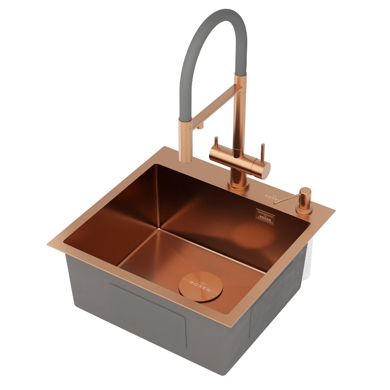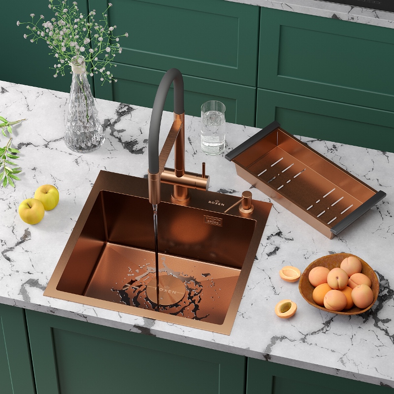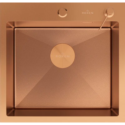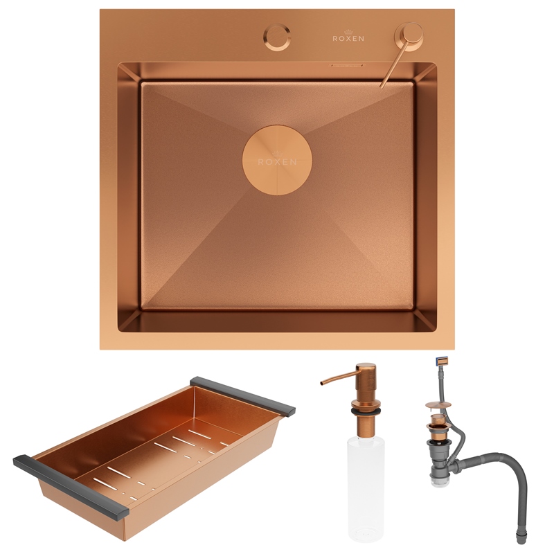 Мойка для кухни Roxen Simple 50x48, врезная, с коландером, дозатором, PVD текстура песок, бронза. Все характеристики |