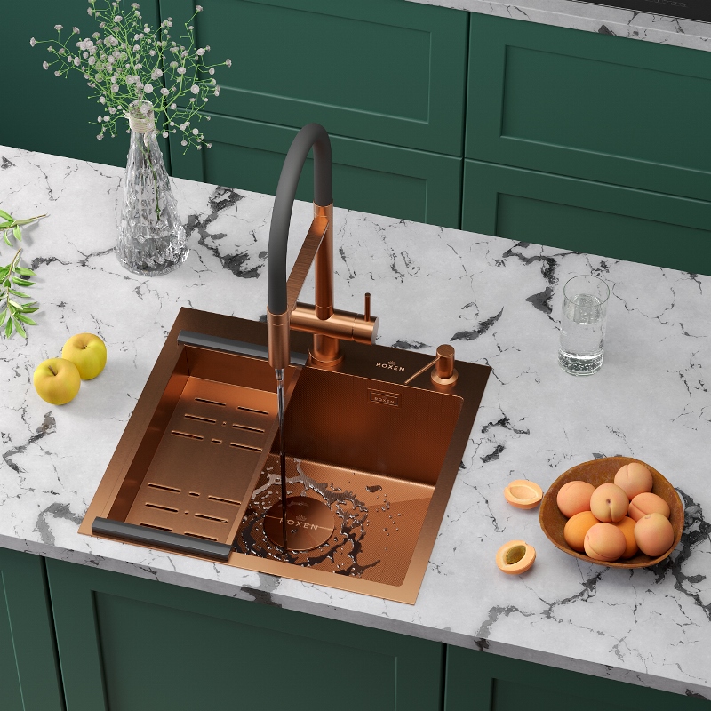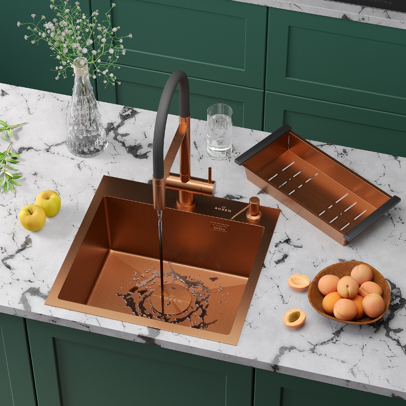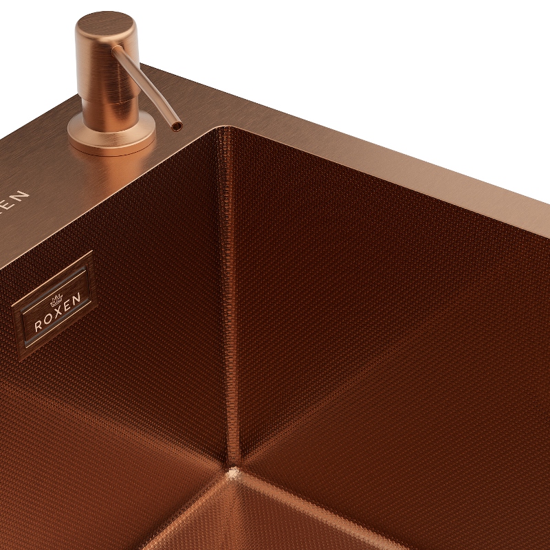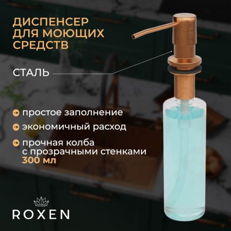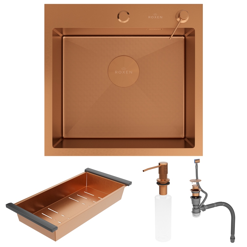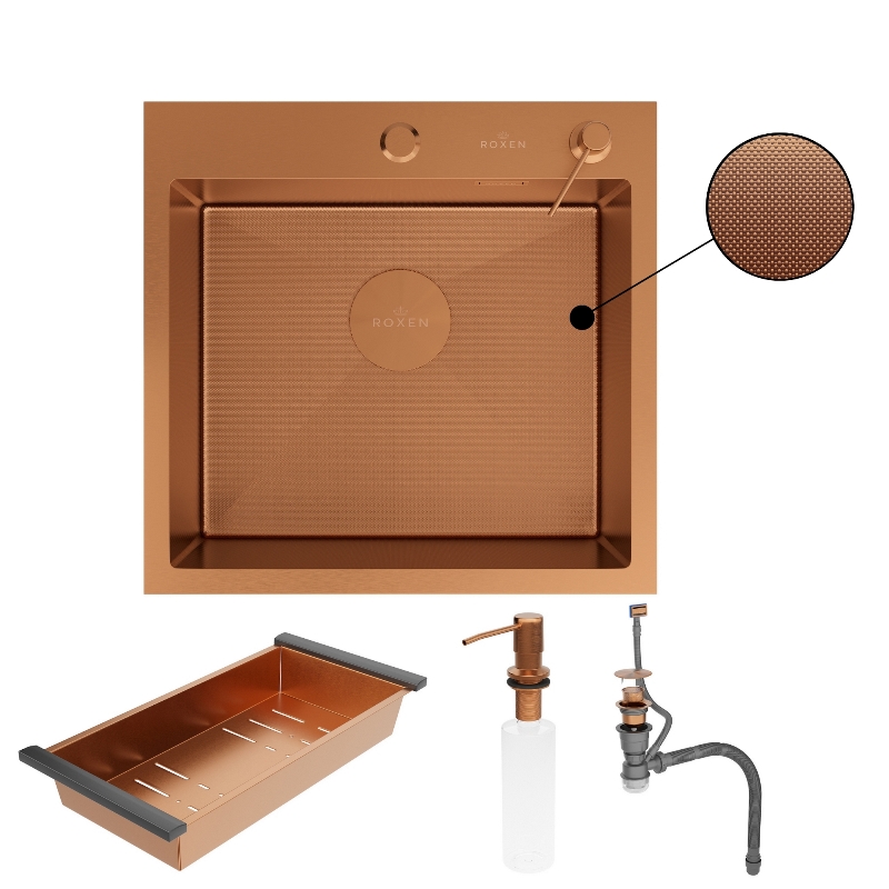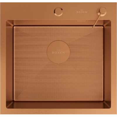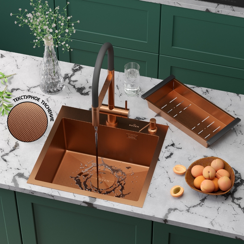 Мойка для кухни Roxen Simple 50x48, врезная, с коландером, дозатором, PVD текстура зерно, бронза. Все характеристики |