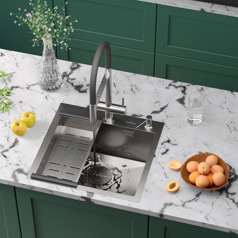 Кухонная мойка Roxen Simple 50x48 560220-50-V, врезная, с коландером и дозатором из аустенитной низкоуглеродистой стали марки AISI 304Свойства материала. Нержавеющая сталь марки AISI 304 устойчива к коррозии, окислению и перепаду температур. Цвет-сатин, поверхность-текстурная "вулканический песок". Матовое покрытие PVD Tech устойчиво к истиранию, появлению царапин и механических повреждений. Обработка водоотталкивающим составом предотвращает накопление бактерий. Шумопоглощающее покрытие располагается по всей чаше мойки: шумоподавляющий состав Silent Protection и шумопоглощающие пластины Soft Silence. Толщина крыла-3 мм, стенок и дна-1.5 мм. Сифон с корзинчатым вентилем для быстрого удаления отходов. Диспенсер для жидкого мыла объемом 300 мл с прозрачной колбой. Коландер из нержавеющей стали с резиновыми накладками. В мойке 2 заводских отверстия для смесителя и дозатора. Раковина для кухни Simple 50x48 см 560220-50-V для врезного монтажа. Производство Компания Roxen основана в Финляндии. Благодаря современному оборудованию, инновационным технологиям и строгому скандинавскому подходу ее продукция заслуженно держится в топе продаж. Качество Сантехника Roxen изготовлена только из проверенных, безопасных материалов. Каждое изделие проходит обязательную проверку на соответствие международным стандартам. Высокая надежность, безупречные линии и доступность делают изделия Роксен привлекательным выбором на любой вкус. Гарантия. Длительная гарантия - 10 лет. Изображение на мониторе может отличаться от оригинала. Комплектность: