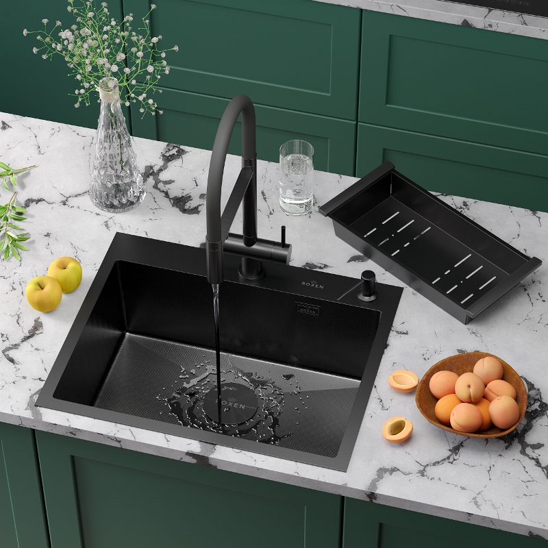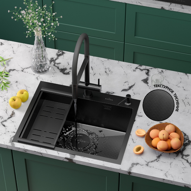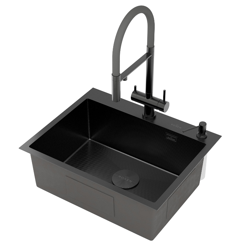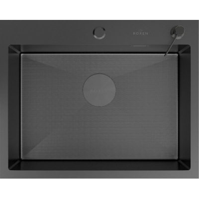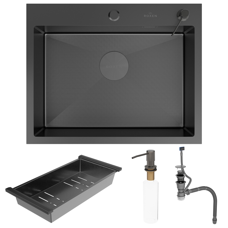 Мойка для кухни Roxen Simple 60x48, врезная, с коландером, дозатором, PVD текстура зерно, графит. Все характеристики |