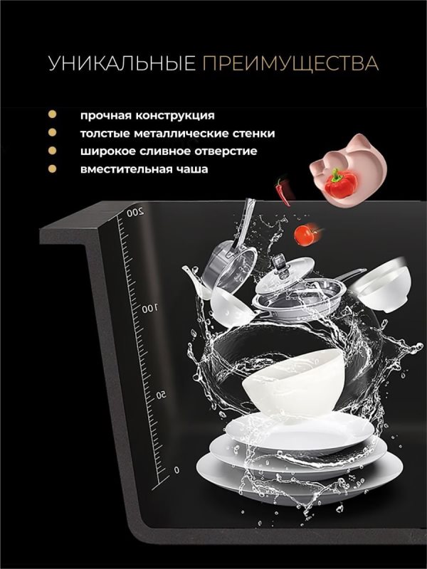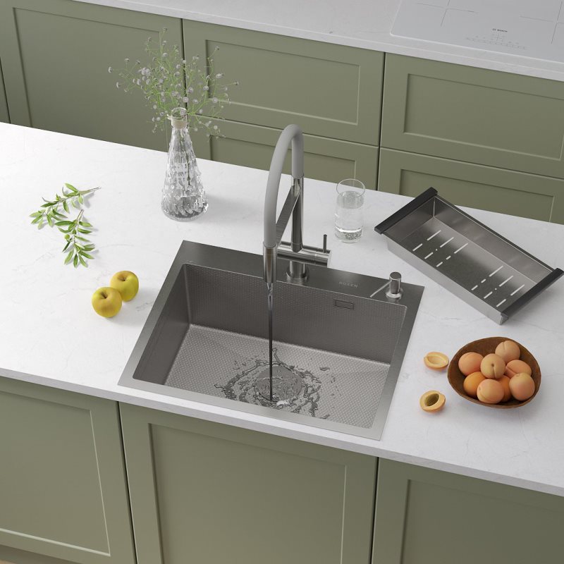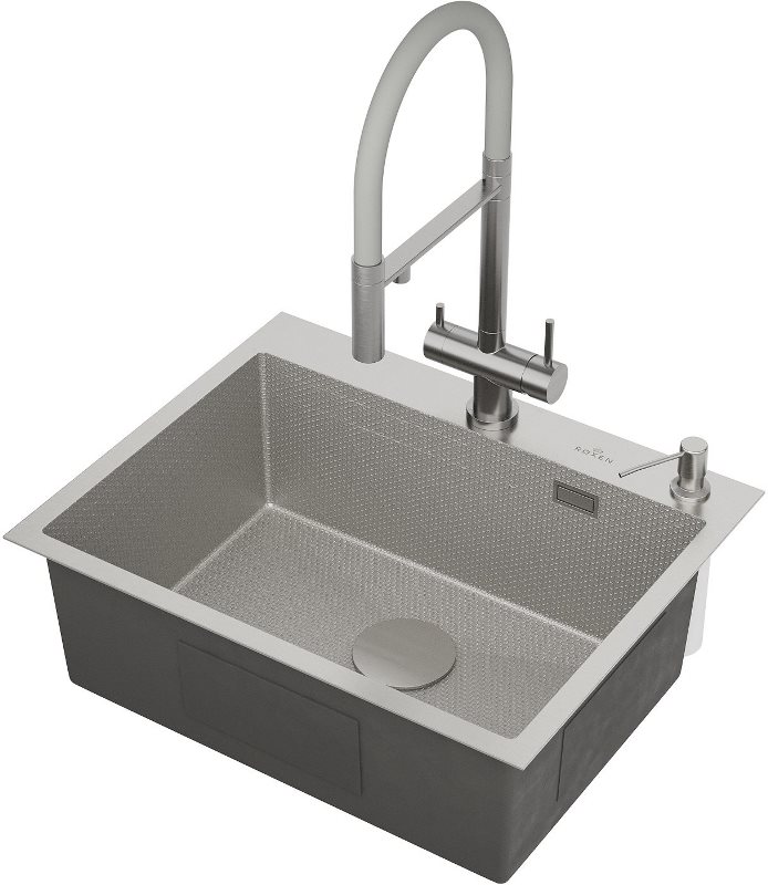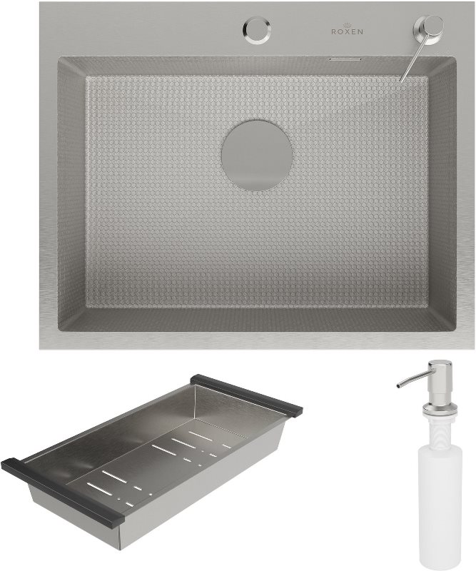 Мойка для кухни Roxen Snake 60x48, врезная, с коландером, дозатором, текстурный сатин. Все характеристики |