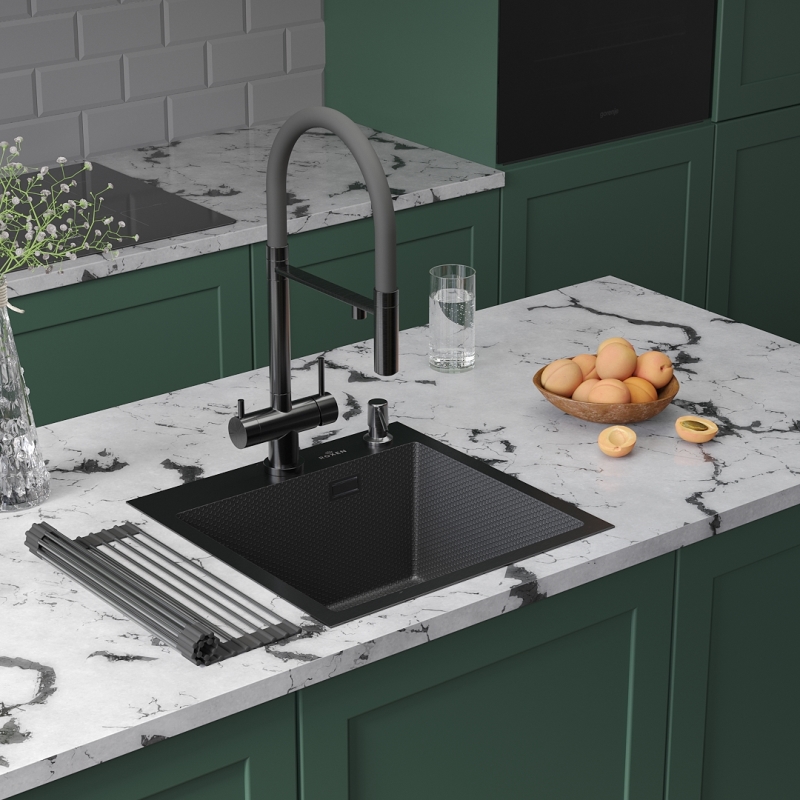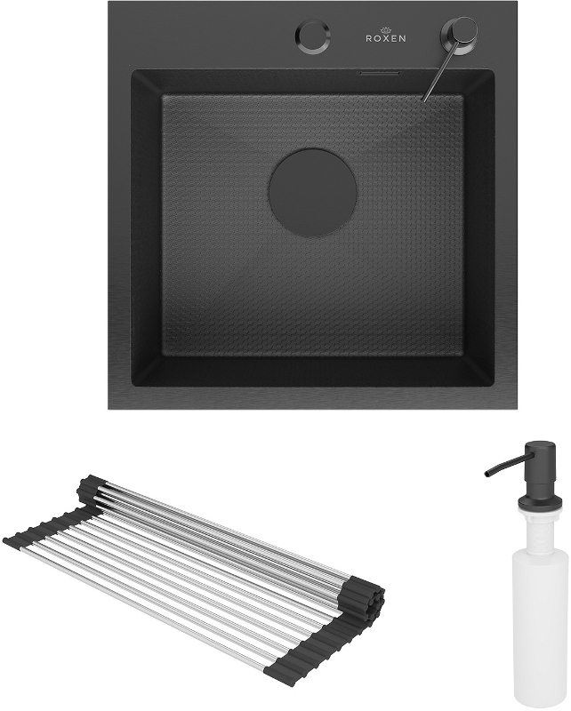 Мойка для кухни Roxen Snake PVD 45x45, врезная, с рол-матом, дозатором, текстурн. оруж. сталь. Все характеристики |
