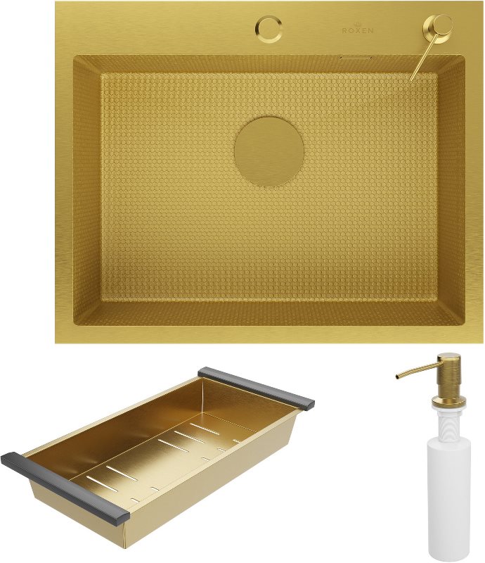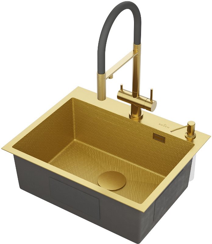 Мойка для кухни Roxen Snake PVD 60x48, врезная, с коландером, дозатором, текстурное золото. Все характеристики |
