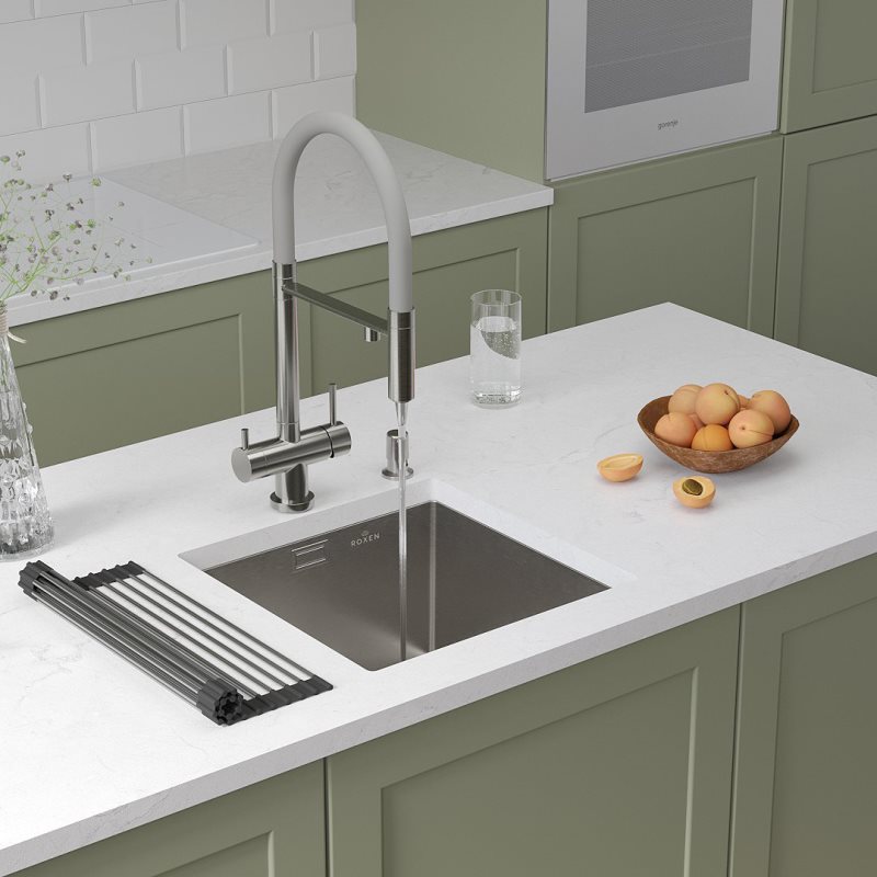 Мойка для кухни Roxen Uno 44x44, под столешницу, с рол-матом, дозатором, сатин. Все характеристики |