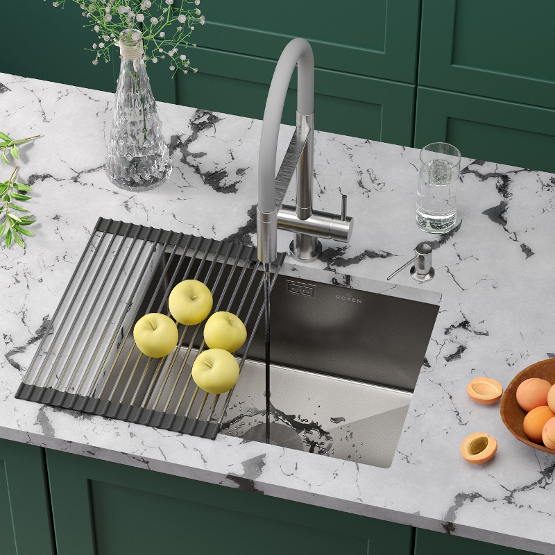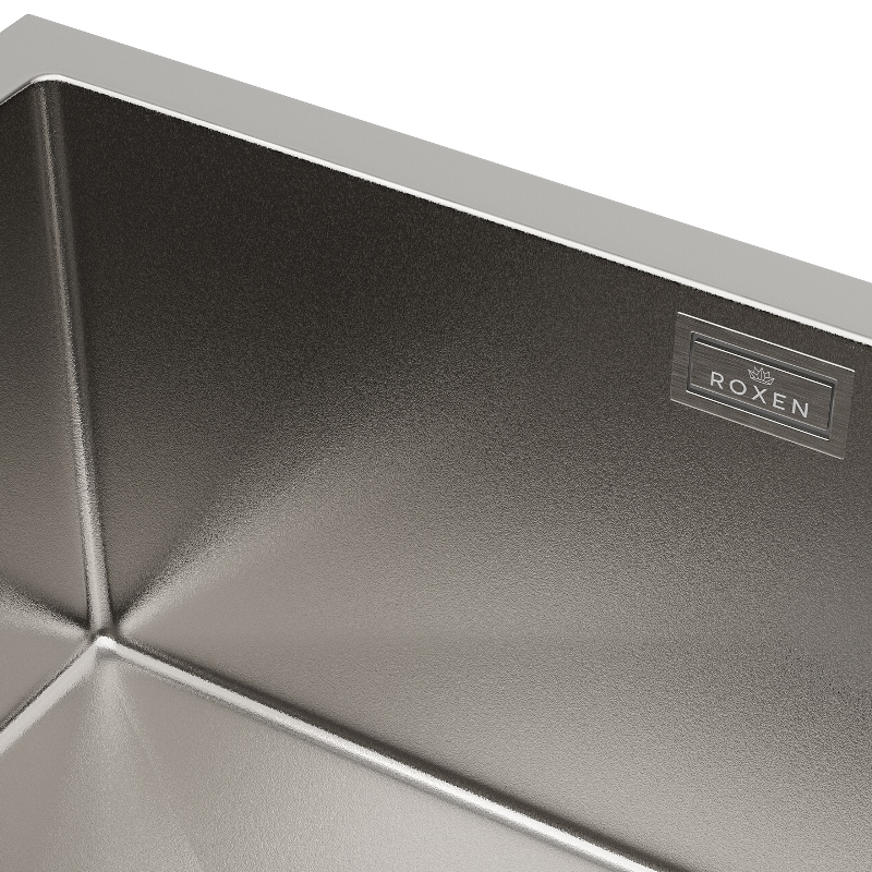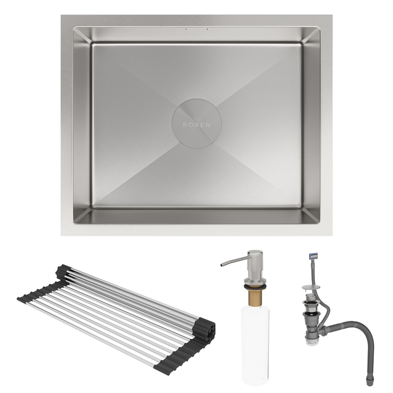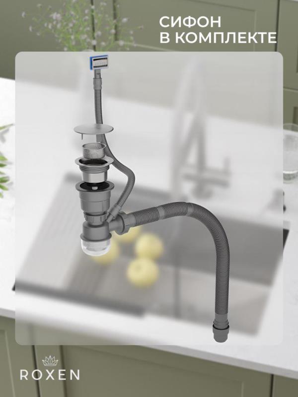 Мойка для кухни Roxen Uno 54x44, под столешницу, с рол-матом, дозатором, текстура песок, сатин. Все характеристики |