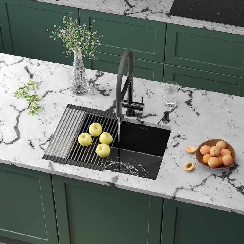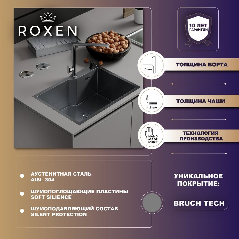 Мойка для кухни Roxen Uno PVD 54x44, под столешницу, с рол-матом, дозатором, графит. Все характеристики |