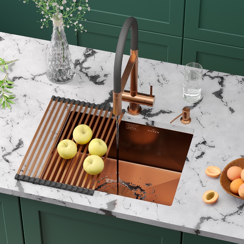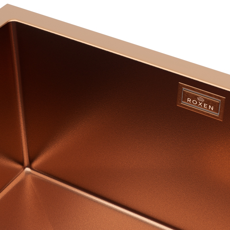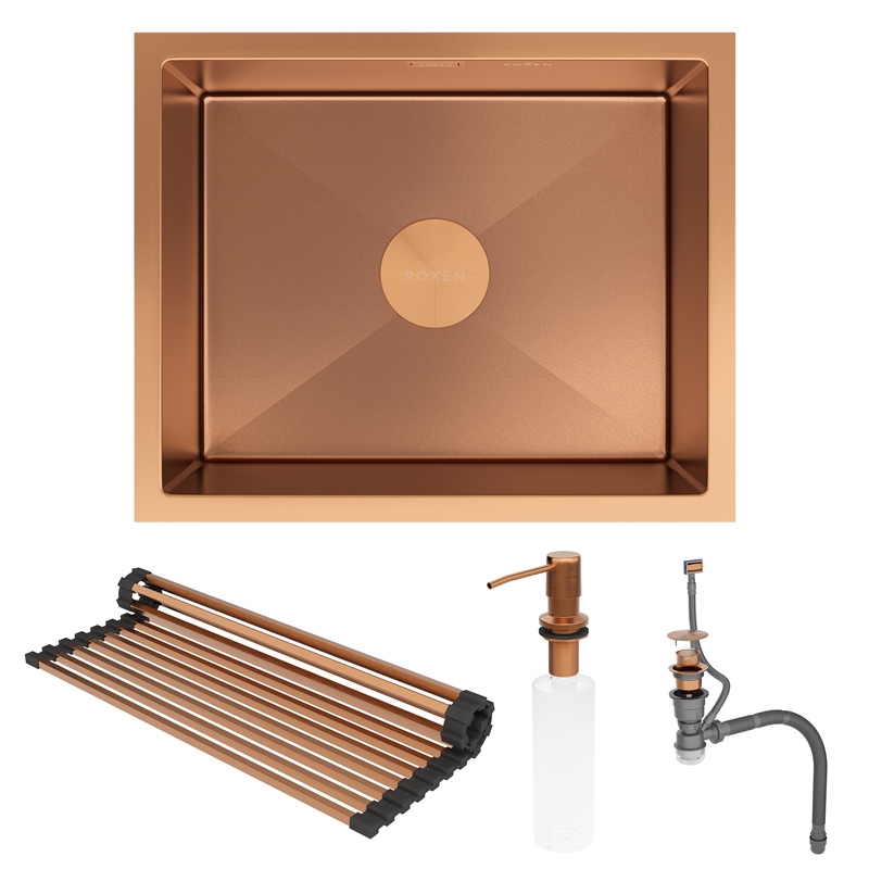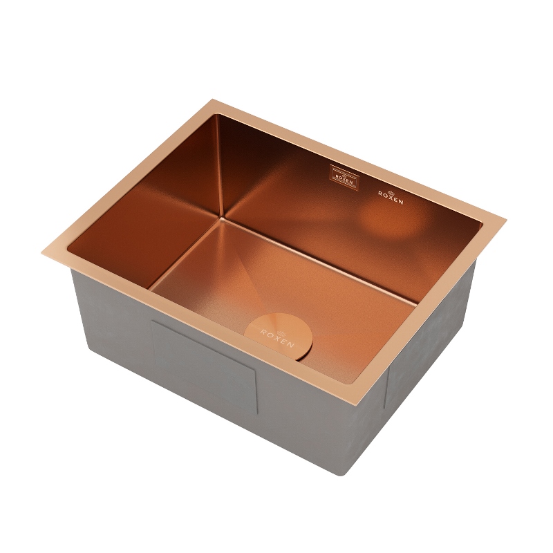 Мойка для кухни Roxen Uno PVD 54x44, под столешницу, с рол-матом, дозатором, текстура песок, бронза. Все характеристики |