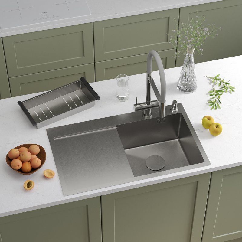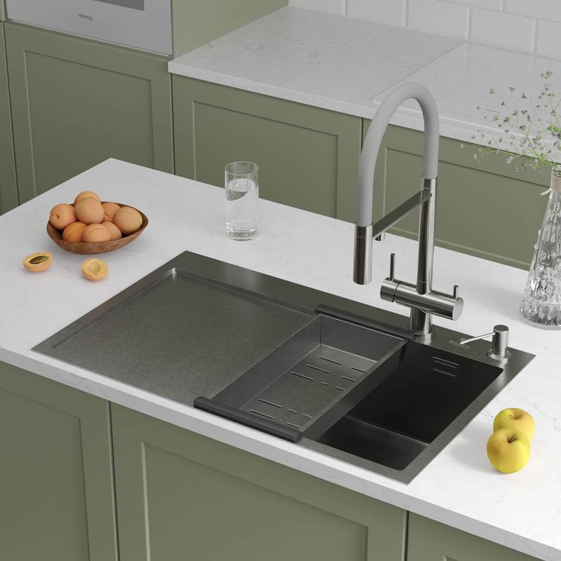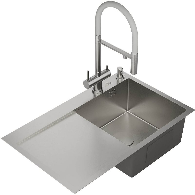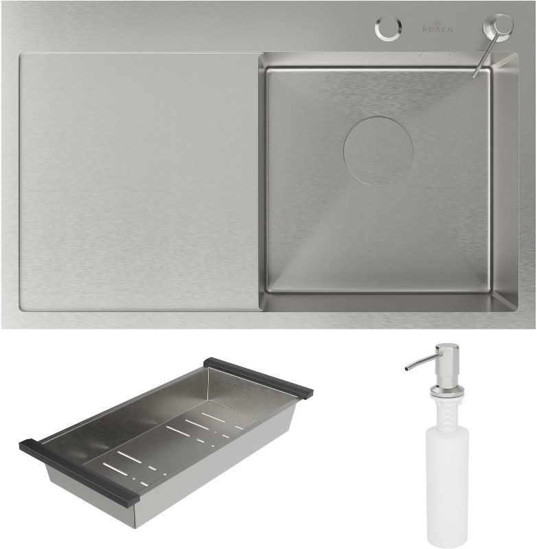 Мойка для кухни Roxen Vespa 78x48, врезная, правая, с коландером, дозатором, сатин. Все характеристики |