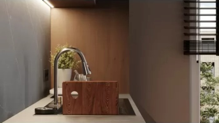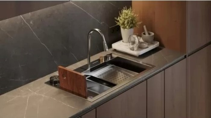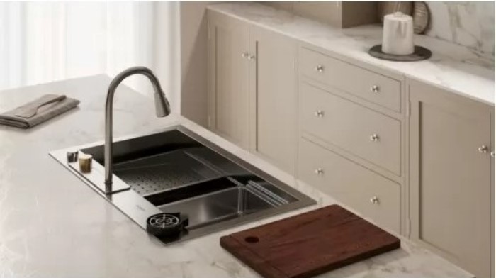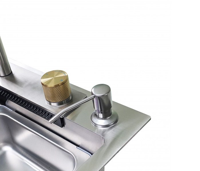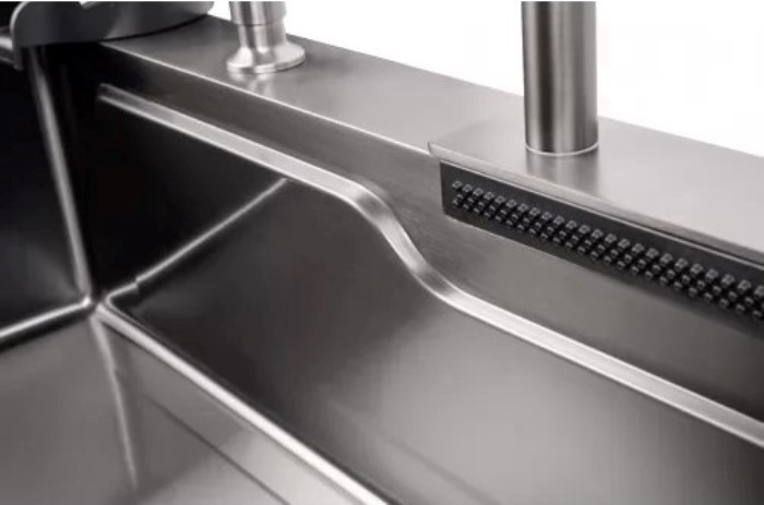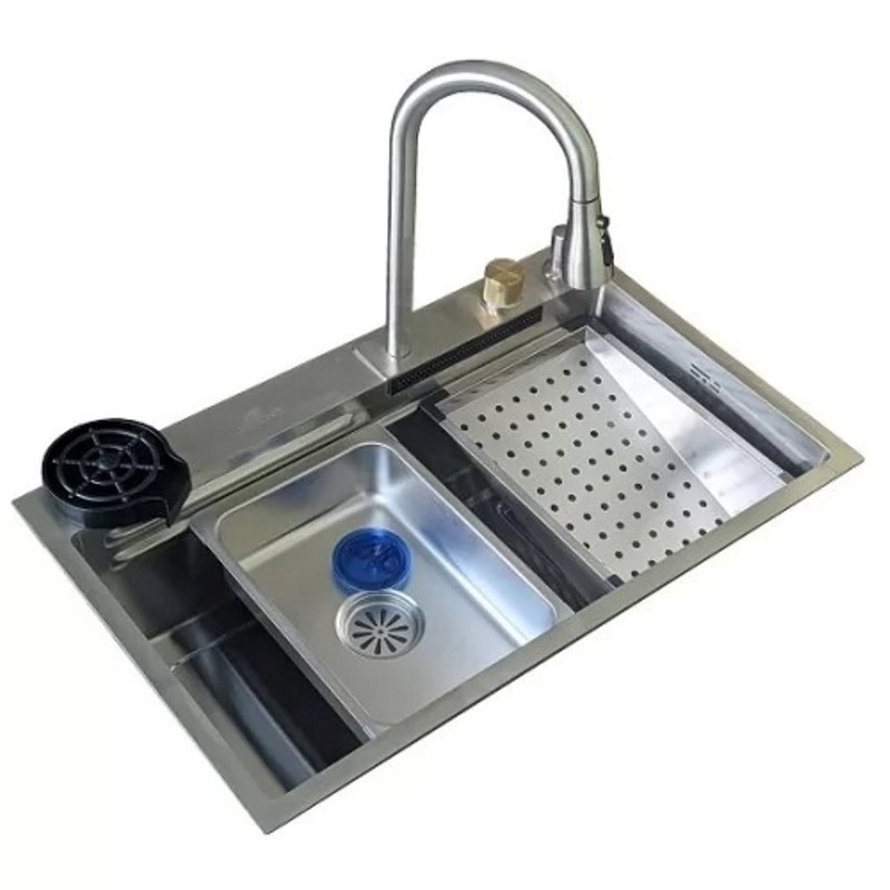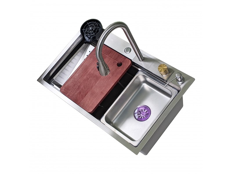 В комплекте: сифон, корзина горизонтальная, корзина с уклоном, ринзер, дозатор, доска разделочная деревянная, кран под фильтр питьевой воды, смеситель с выдвижной лейкой и блоком водопад.. |