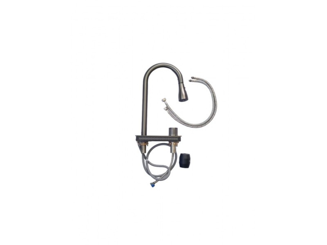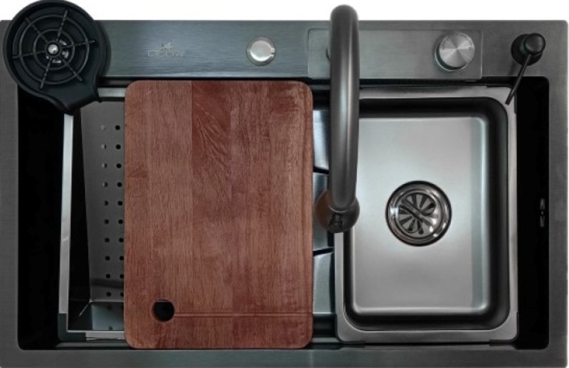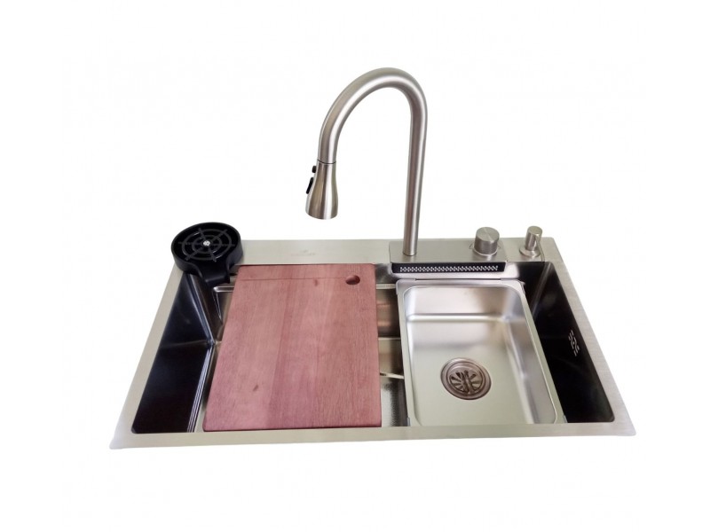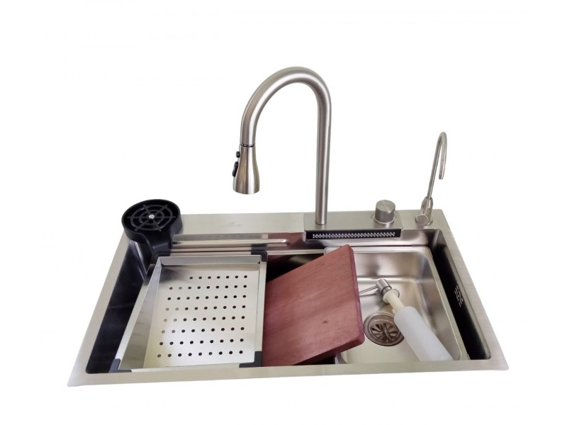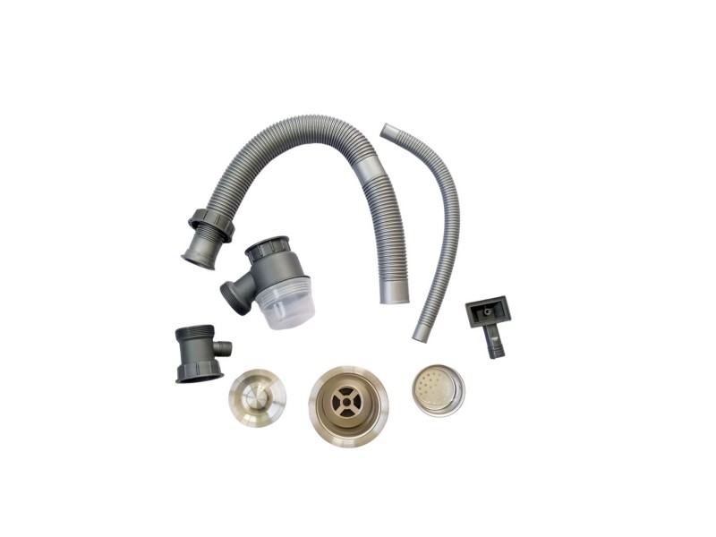 В комплекте: сифон, корзина горизонтальная, корзина с уклоном, ринзер, дозатор, доска разделочная деревянная, кран под фильтр питьевой воды, смеситель с выдвижной лейкой и блоком водопад.. |