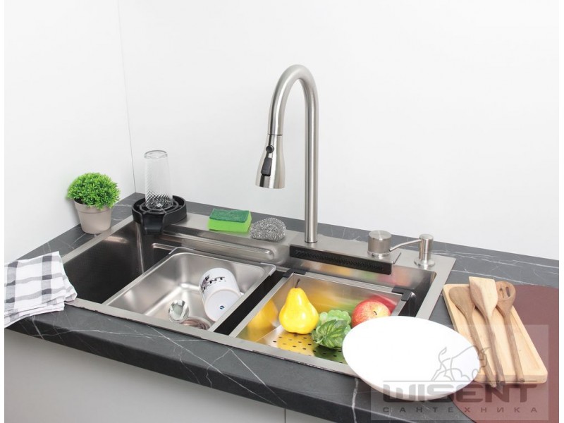 Мойка для кухни Wisent WG37546D 75x46, врезная, со смесителем, аксессуарами, ткестур., сатин. Все характеристики |